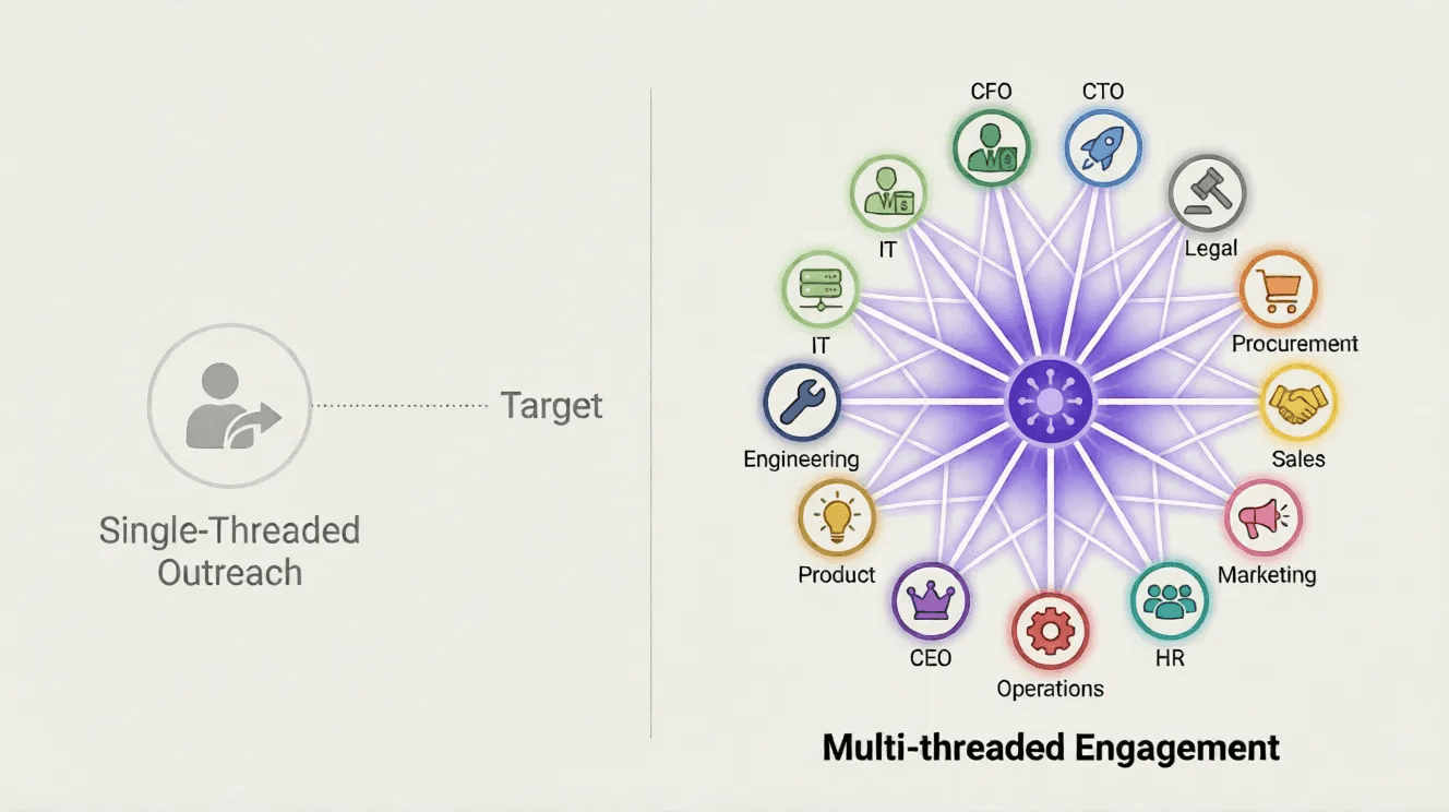 Buying committee blindness is the most common. A single contact in an account with 13 decision-makers means 92% of the committee never sees your campaign. Multi-threaded engagement, reaching three or more stakeholders in parallel, closes deals at two to three times the rate of single-contact outreach. Enrichment solves this by mapping the full organizational chart and supplying verified contact data for each stakeholder role.
