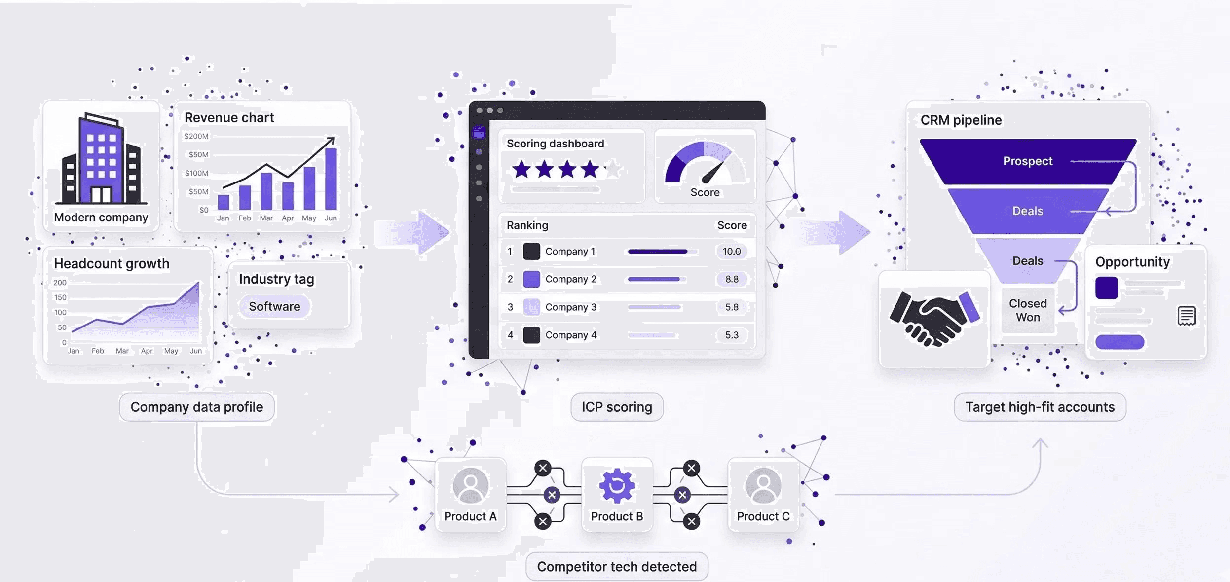 Having a deep profile of a company is only valuable if you know how to turn that information into a sales opportunity. Company enrichment powers ICP scoring that drives GTM success. Instead of guessing which accounts to target, they use firmographic data such as revenue growth and headcount surges to rank companies by their likelihood of buying.