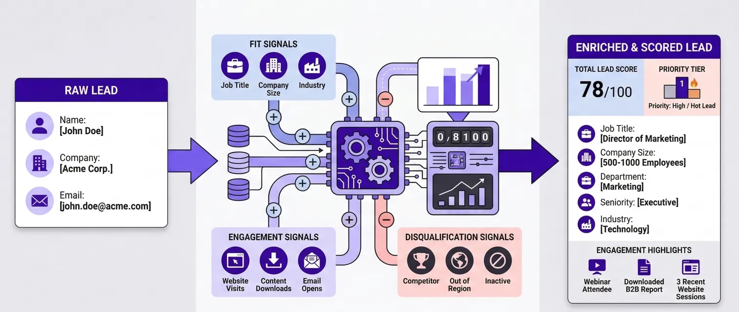 The result is that every lead entering the scoring model arrives with complete fields. Scores reflect actual fit and engagement rather than defaulting to zero because a company size field was empty.