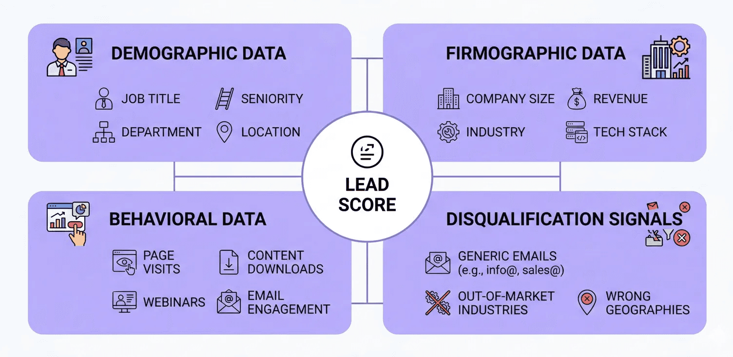 Lead scoring models draw from four categories of data, each capturing a different dimension of prospect quality. Understanding the role of each helps teams build models that reflect real conversion patterns rather than assumptions.